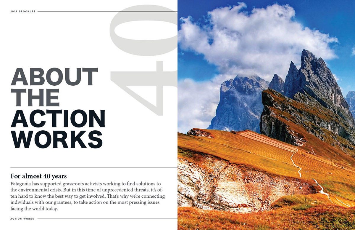 Patagonia Action Works is an activist platform founded by the popular clothing brand, Patagonia, for the purpose of connecting communities and grassroots organizations together to fight against environmental issues around the world. This brochure attempts to highlight and inform the reader of the action works with the intention of recruiting their time and efforts towards environmental activism. In this brochure, Payton Gaskin expresses a theme of nature and man by juxtaposing organic life with man-made structures. All of the photography in this publication was sourced from the royalty-free website, Unsplash.